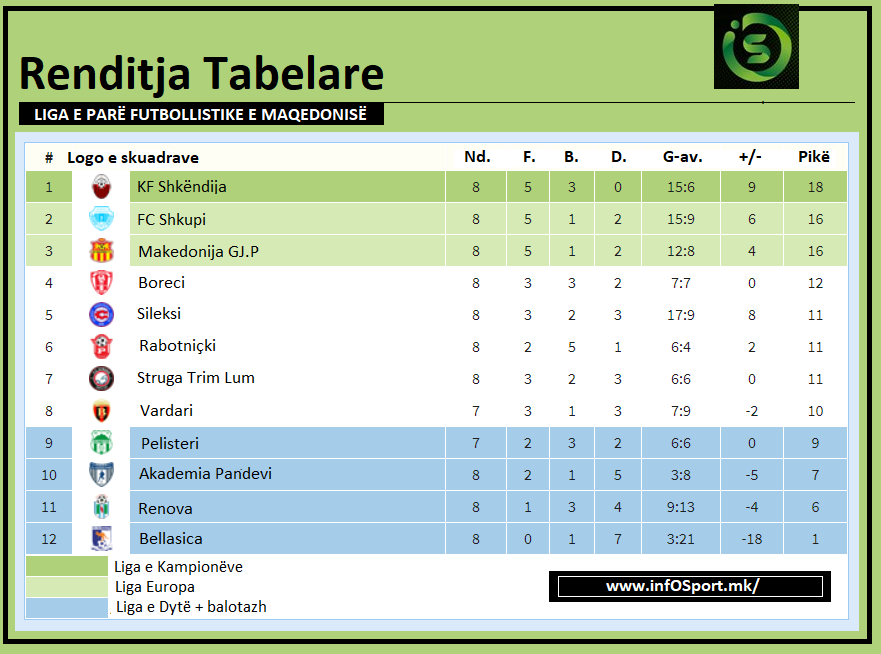 Vardari me 10 pikë dhe një ndeshje më pak mban pozitën e 8-të, duke lënë pas vetes Pelisterin me 9 pikë dhe gjithashtu një ndeshje më pak (takohen sot mes vete), ndërkohë 3 pozitat e fundit janë të rezervuara për Akademia Pandev (7 pikë), Renovën (6) dhe Bellasicën (1).