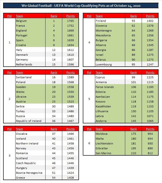 (Kombëtaret e nënvizuara më ngjyrë të gjelbërt janë të sigurta në vazot e tyre, derisa ato me ngjyrë hyri dhe të bardhë mund të ndryshojnë vazo, në varësi nga rezultatet që do i arrijnë deri para fillimit të ciklit eliminatorë “Qatar 2022”)