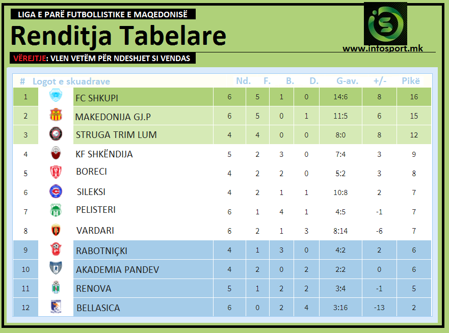 Skuadra strugane me 12 pikët maksimale renditet në pozitën e 3-të, duke lënë pas vetes Shkëndijën, që në 5 ndeshje të zhvilluara në Tetovë ka regjistruar dy fitore dhe 3 barazime, ndërsa pas “kuqezinjëve” me dy fitore dhe dy barazime nga 4 ndeshje renditet Boreci me 8 pikë.