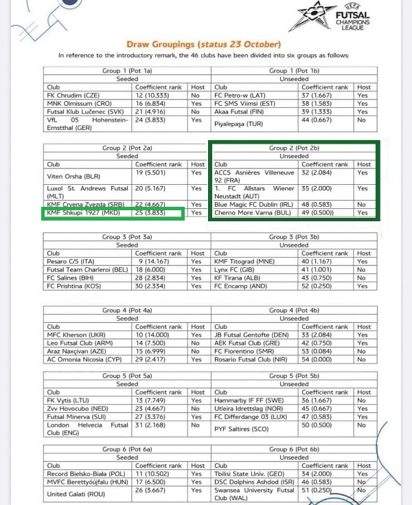 Kështu Futsal Shkupi bënë pjesë në grupin 2. “Bardhekaltërit” nga Çairi janë shortuar në vazon 2A të këtij grupi, bashkë edhe me skuadrën bjelloruse të Viten Orsha, atë nga Malta, Luxol St Andreës, si dhe skuadrën serbe të Crvena Zvezdës. Këto skuadra nuk mund të përballen mes vete, ndërsa për kundërshtarë potencial, kanë bullgarët e Çernomore, Allstars Ëiener Neustadt nga Austria, Blue Magic FC Dublin nga Irlanda dhe skuadrën franceze të ACCS Asnières Villeneuve 92, pjesë e së cilës është edhe lojtari më i mirë në Botë, Rikardinjo.