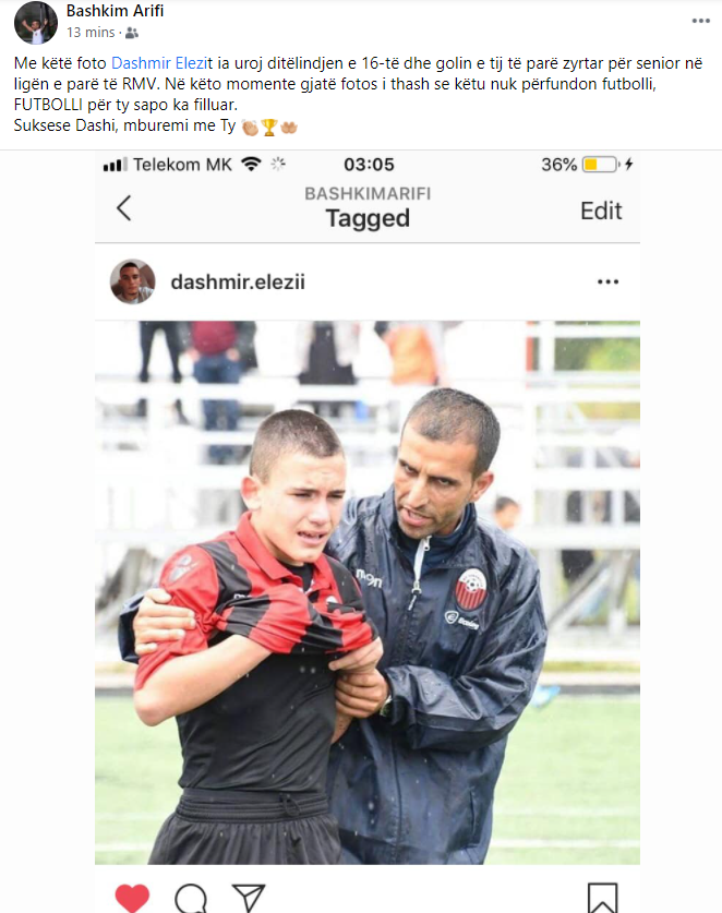 “Me këtë foto Dashmir Elezit ia uroj ditëlindjen e 16-të dhe golin e tij të parë zyrtar për senior në ligën e parë të RMV. Në këto momente gjatë fotos i thash se këtu nuk përfundon futbolli, FUTBOLLI për ty sapo ka filluar. Suksese Dashi, mburemi me Ty 👏🏼🏆🤲🏼” – ka shkruar në profilin e tij zyrtarë, Bashkim Arifi.