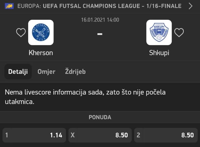 1.14 përllogaritet fitorja e skuadrës ukrainase, ndërkohë fitorja e Futsal Shkupit kuotohet me koeficinetin 8.50. Me po të njëjtin koeficient vlerësohet edhe një barazim në këtë takim, i cili starton në ora 13:00 sipas kohës lokale në vendin tonë.