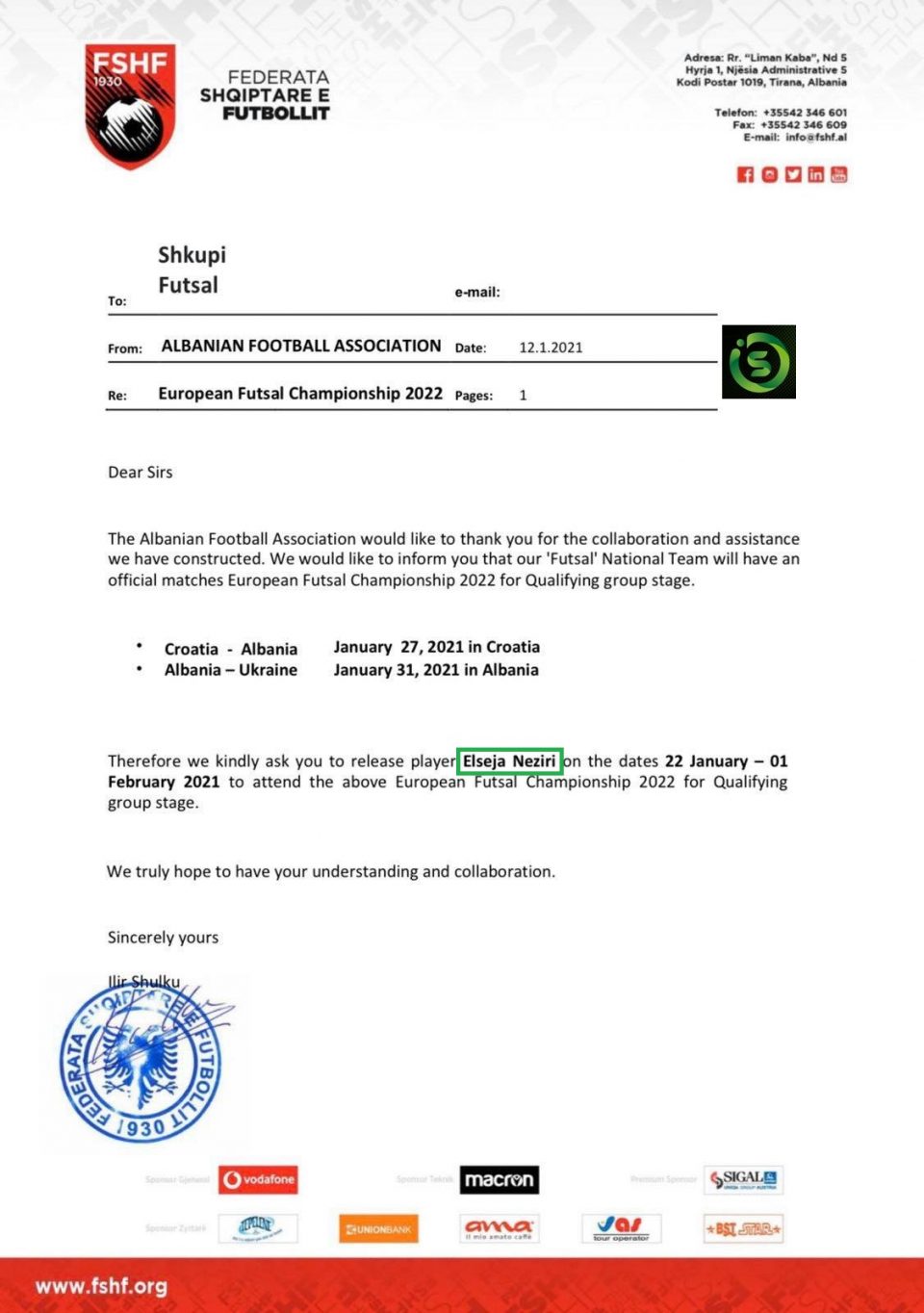 Seleksionuesi i Kombëtares së Shqipërisë në Futsal, Erind Resuli për ndeshjet kualifikuese kundër Kroacisë dhe Ukrainës në kuadër të ciklit për kualifikim në Kampionatin Europian, ka ftuar edhe lojtarin shkupjan, Eljesa Neziri, njofton “infOSport.mk”.