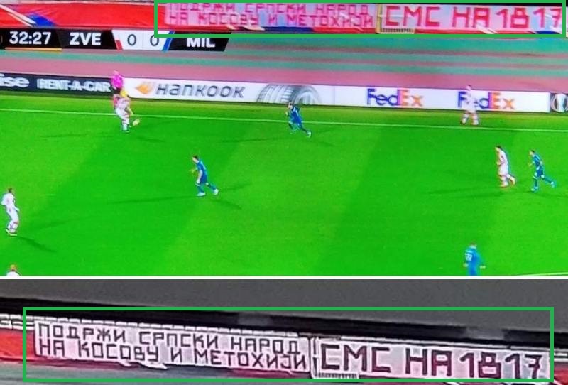 Tifozët serb në tribuna, kishin shfaqur një baner ku shkruante: “Mbeshtetni popullin serb në Kosovë e Metohijë”.