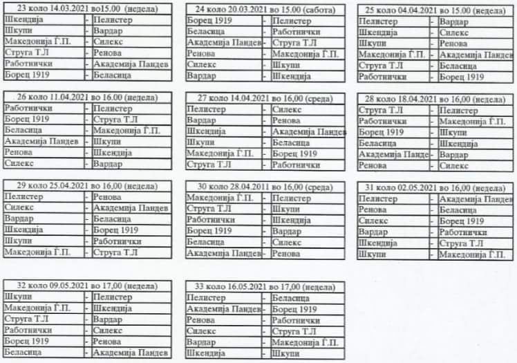 Kështu në xhiron e parë, apo javën e 23-të do të jemi dëshmitarë të derbit të vjetër shkupjan, FC Shkupit dhe Vardarit, Shkëndija si nikoqir në Tetovë do të mirëpret Pelisterin, ndërkohë në Strugë do të zhvillohet dueli mes skuadrave shqiptare, Struga Trim Lum dhe Renovës.