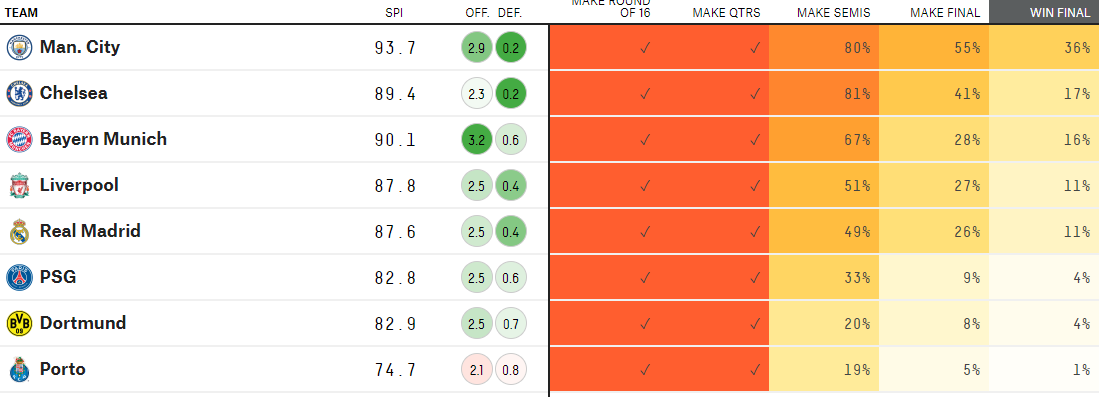Ndërkohë dy skuadrat kampione të viteve 2018 dhe 2019 Real Madridi dhe Liverpulli renditen në vendin e 4-të dhe 5-të me shanse të barabartë fitimi prej 11%. PSZh-ja ndodhet në vend të 6-të me 4% me shanse të barabarta me Borusinë e Dortmundit, ndërsa në vend të fundit renditet Porto me 1% të shansit për të fituar Ligën e Kampionëve.