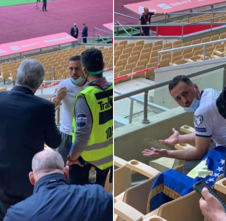 Ekspedita e gazetarëve nga Kosova derisa po qëndronin në tribuna me flamujt kosovar, kanë hasur në probleme.