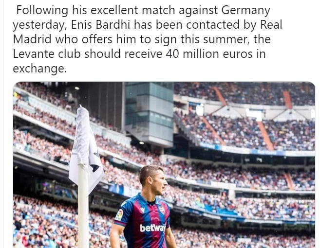 Skuadra gjigande spanjolle, Real Madridi ka shfaqur interesim për shkupjanin, Enis Bardhi. “Mbretërit” për aktualisht fubollistin e Levantes ofrojnë 40 milion euro, një shumë kjo e majme për të bindur edhe drejtuesit e skuadrës nga Valencia që në verë të futen në bisedime me homologët nga Santiago Bernabeu.
