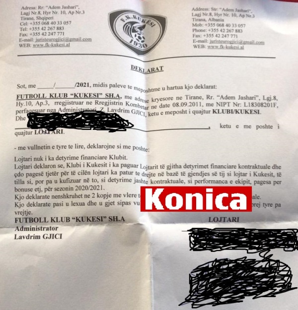 Ndërkohë, një foto e siguruar nga i njëjti burim tregohet një deklaratë në të cilën lojtarët duhet të heqin dorë nga pagat e padhëna dhe të pranojnë se klubi nuk i ka asnjë detyrim financiar atyre.