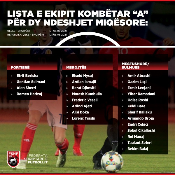 Trajneri i kombëtares shqiptare, Edi Reja ka publikuar listën me futbollistët e grumbulluar për dy ndeshjet e radhës të kuqezinjve. Bëhet fjalë për dy sfida miqësore të datës 5 dhe 8 qershor, respektivisht ndaj Uellsit dhe Republikës Çeke, të dyja në transfertë.