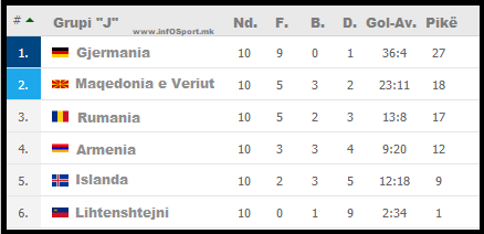 Pas Gjermanisë (27 pikë) dhe Maqedonisë (18) në dy vendet e para, Rumania me 17 pikë u rendit në pozitën e tretë, para Armenisë që në 10 ndeshje grumbulloi 12 pikë, 3 më shumë se Islanda e vendit të 5-të, ndërkohë Llihtenshtejni me vetëm 1 pikë e mbylli edhe këtë cikël eliminatorë në pozitën e fundit. (infOSport.mk)