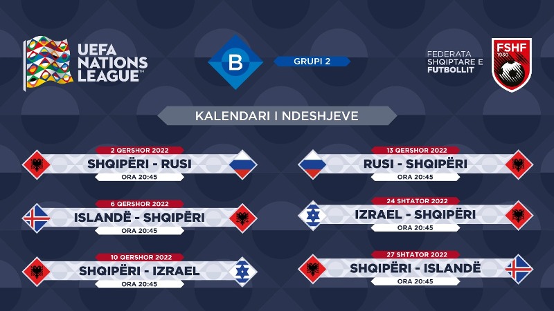 Më poshtë, edhe kalendari i plotë me data dhe orare i ndeshjeve të Shqipërisë në grupin B2 të Ligës së Kombeve, edicioni 2022-23.