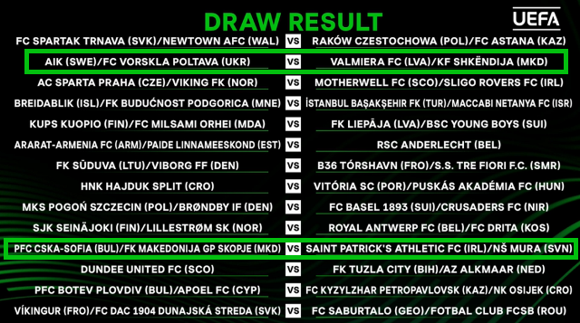 Ndërkohë Makedonija GJ.P e Muharem Bajramit në turin e tretë eliminatorë të Ligës së Konferencës, nëse do të kalonte bullgarët e CSKA Sofjes, do të përballej me fituesin nga përballja, Sent Patriks Athletic FC/Mura.