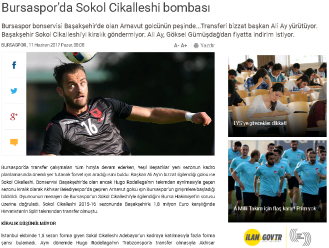 Oferta të shumta për sulmuesin e Kombëtares shqiptare, Sokol Cikalleshin. Së fundmi është shfaqur edhe Bursaspori që interesohet për 26 vjeçarin. Ka qenë presidenti i klubit Ali Ayin, i cili personalisht është vënë në lëvizje për shërbimet e Cikalleshit. Sipa mediave turke, vlera e kartonit të sulmuesit shqiptar shkon deri në