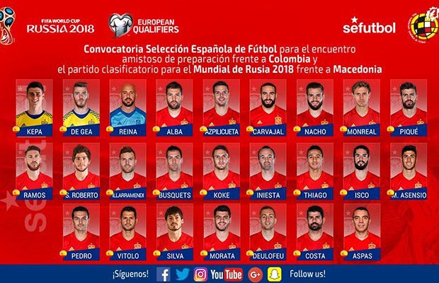 Përfaqësuesja e Spanjës në Shkup do të vjen me të gjithë yjet që posedon. Seleksionuesi Hulen Lopetegi ka publikuar listën e futbollistëve që ka përfshirë për ndeshjen ndaj Maqedonisë që do të luhet në kuadër të eliminatoreve për Botërorin Rusi 2018. Në listën e Lopetegit prej 25 futbollistëve janë të përfshirë