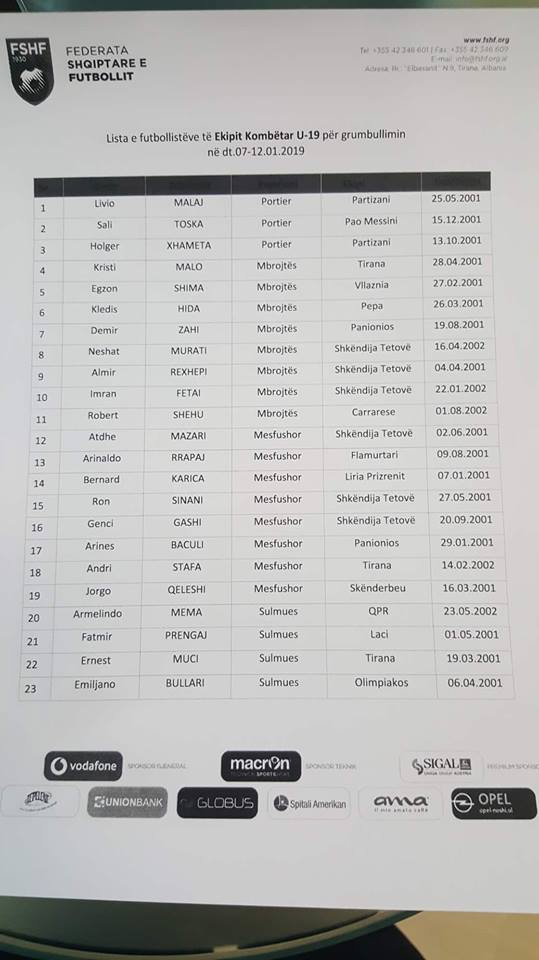 Seleksionuesi i Kombëtares U19 të Shqipërisë, Nevil Dede ka publikuar listën me futbollist për ndeshje miqësore. “Kuqezinjtë” U19 do të zhvillojnë një minifazë stërvitore të kombinuar me disa ndeshje miqësore në grumbullimin në kompleksin “Tropikal” në Durrës.